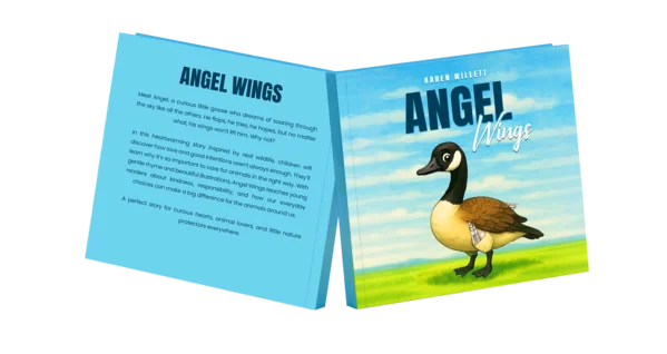 Angel Wings is a tender, rhyming picture book that tells the story of a goose born with wings that just won’t lift him into the sky. As he watches others soar above, he begins to wonder why he can’t do the same. Through gentle storytelling and beautiful illustrations, young readers learn how well-meaning choices, like feeding bread to birds, can have lasting effects.